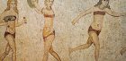 Mosaico procedente de la villa romana de Casale (Piazza Armenia, Sicilia), datado en el primer cuarto del siglo IV d.C. Se conoce como el “mosaico de las chicas del bikini”. En la época imperial, las termas, constituían el principal referente de la vida social romana. Imitación de los gimnasios griegos de la época helenística. Las termas las construía el estado y cobraba por la entrada una cantidad que estaba al alcance del ciudadano medio. El horario estaba establecido para las mujeres el de mañana, que terminaba a las 14 horas; por otro lada pagaba el doble que los hombres. La reiterada prohibiciones por parte de los emperadores de los baños mixtos indica que no se respetaban.